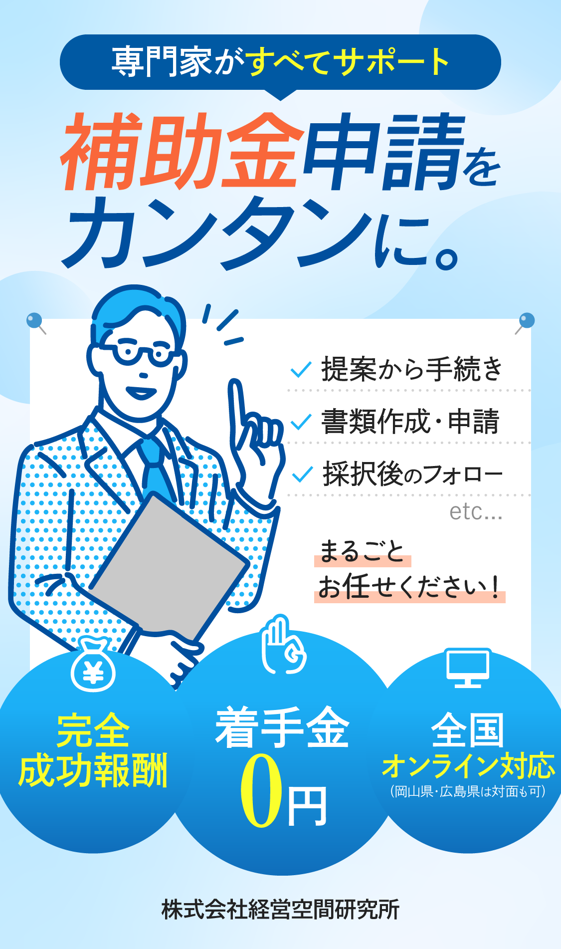 弊社は、補助金の提案から申請手続きまでをトータルでサポートし、成功報酬型でご利用が可能です。また返還義務のある補助金も含め、本当に申請すべきかを見極めた最適なプランをご案内します。